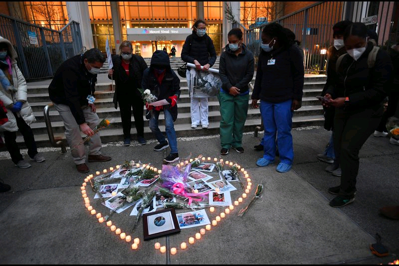 Nurses and healthcare workers light candles in the shape of a heart as they mourn and remember their colleagues who have died during the outbreak of the coronavirus during a vigil outside Mount Sinai Hospital in Manhattan on April 10, 2020. (JOHANNES EISELE/AFP via Getty Images)