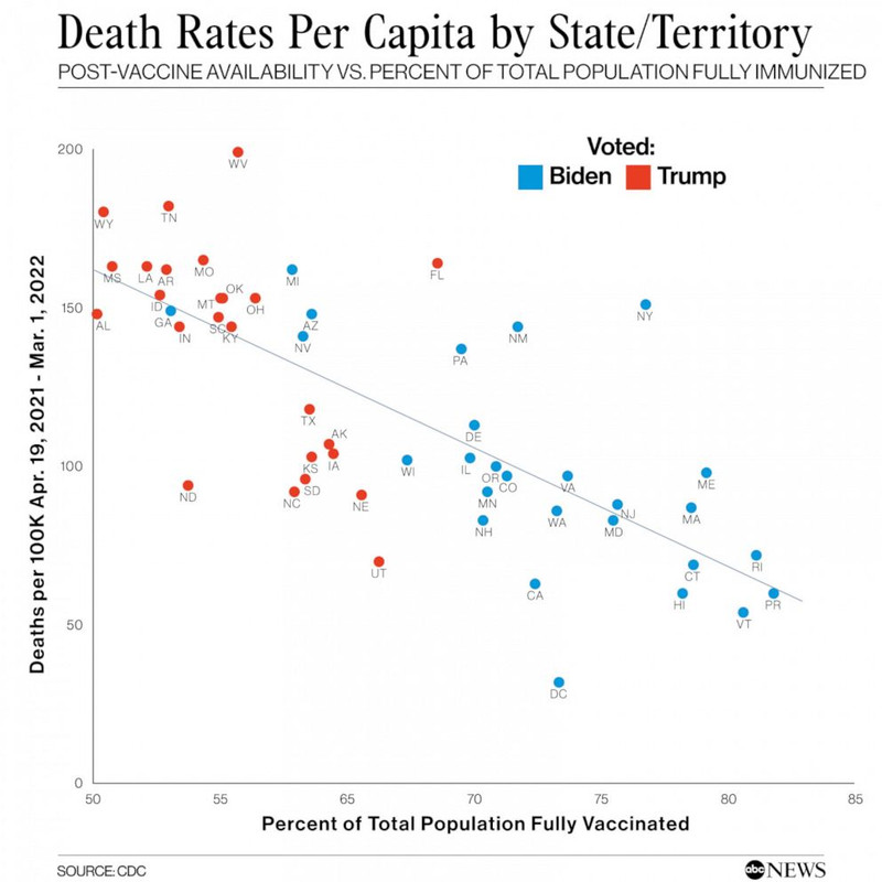 An ABC News analysis of federal data found that on average, the death rates in states that voted for Trump were more than 38% higher than in states that voted for Biden, post widespread vaccine availability.