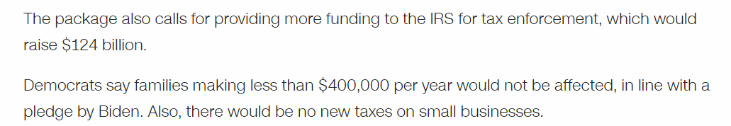 The package also calls for providing more funding to the IRS for tax enforcement, which would raise $124 billion.