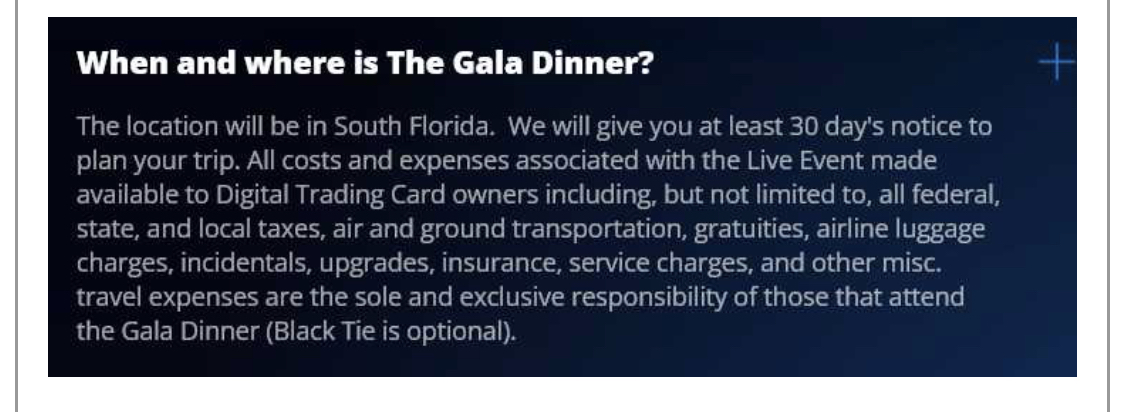 Purchasers of the card will also automatically be entered into a sweepstakes for a "chance to win 1000's of incredible prizes and meet the one and only #45!" though a purchase of a card is not required to enter the contest. According to the fine print, the prizes include 2,533 NFTs, totaling an approximate value of $54,695.