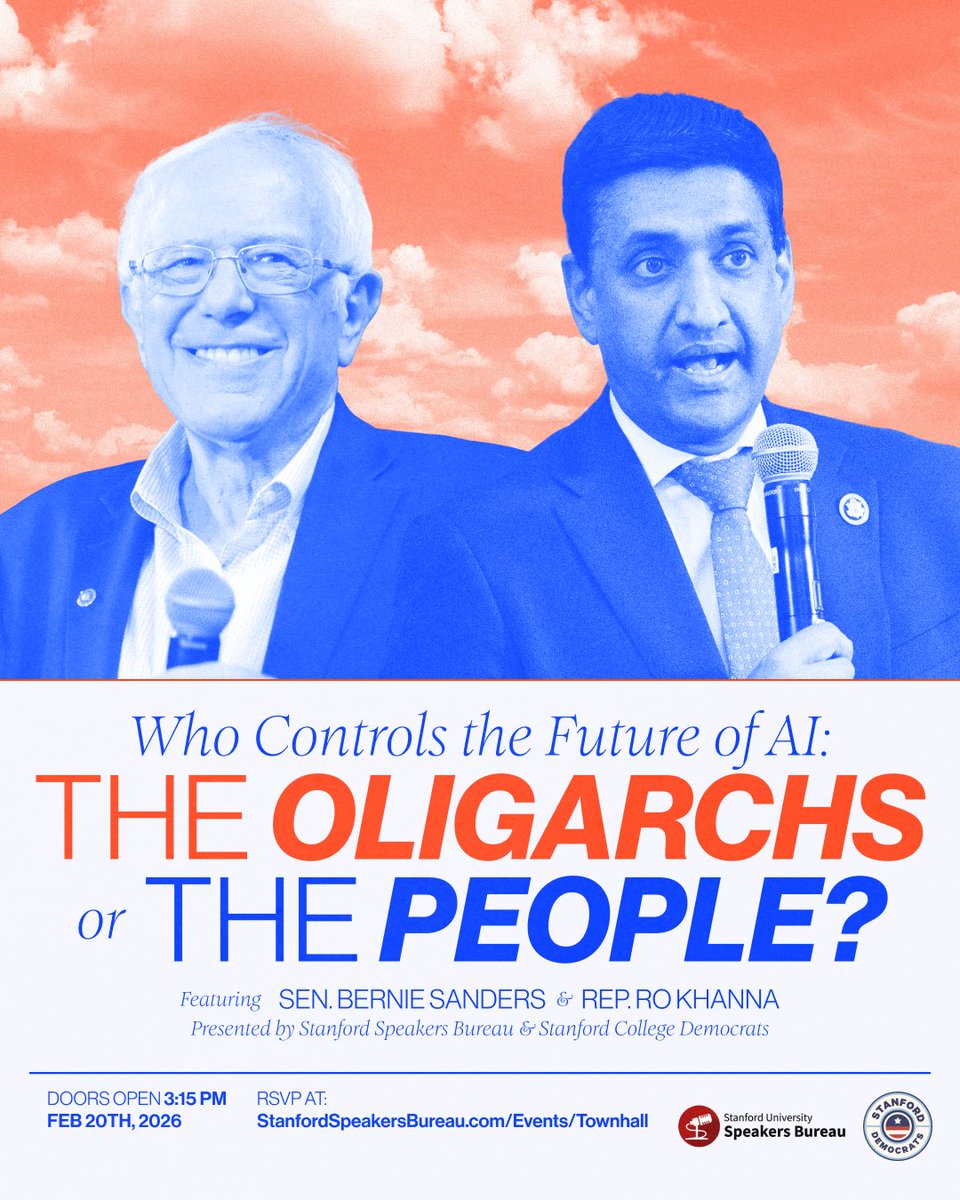 Join Stanford Democrats & Stanford Speakers Bureau for a private townhall with Senator Bernie Sanders and Representative Ro Khanna on Who Controls the Future of Al: THE OLIGARCHS or THE PEOPLE? This event is only open to Stanford affiliates.