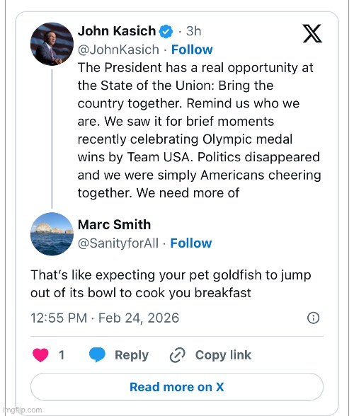 He sees glimpses of lardass not being egregiously offensive and thinks "he's like normal people." I think Kasich is actually a goldfish.
