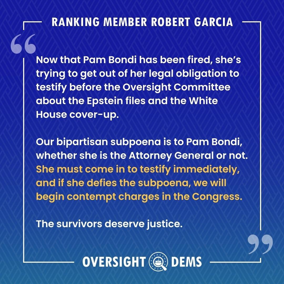 The removal of Pam Bondi as Attorney General does not diminish the Committees legitimate oversight interests in seeking her sworn testimony or the need for accountability and information about files withheld from the public by the DOJ, Khanna and Mace wrote. On the contrary, it makes her sworn testimony even more important, especially with respect to actions she took as Attorney General, matters already under investigation, and decisions made under her leadership.