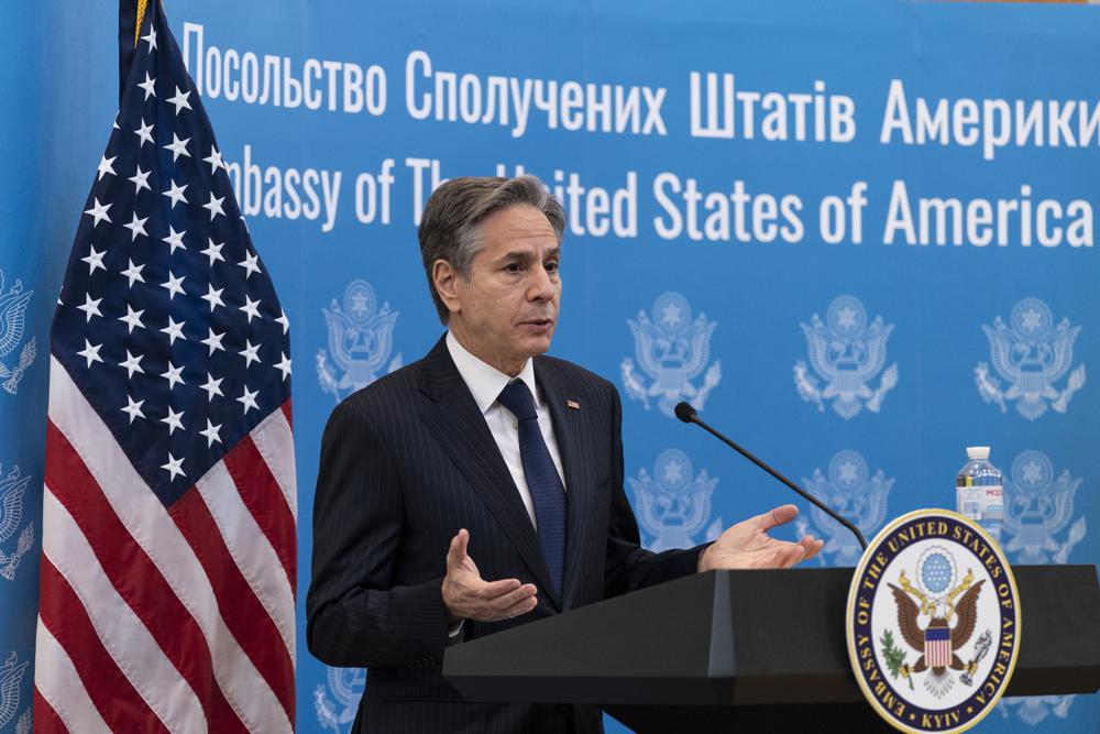 United States Secretary of State Antony Blinken speaks as he greets embassy staff at the U.S. embassy, in Kyiv, Ukraine, Wednesday, Jan. 19, 2022. (AP Photo/Alex Brandon, Pool)