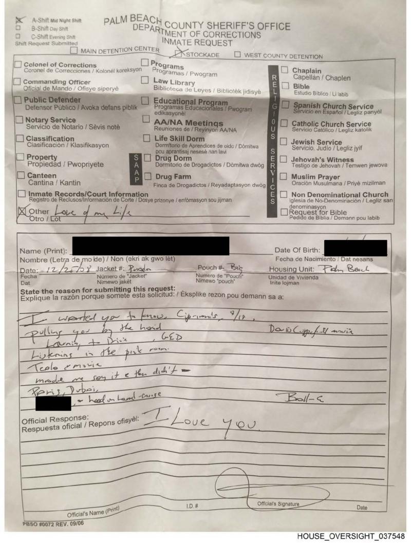 (8,640 posts)Note the date on it is Christmas Day 2008. I can't read all the writing but a couple lines say "leaning to drive, GED" & "Listening in the Pink Room". Then later there is a line that says "made me say it & then didn't". next line mentions Paris, Dubai. I can't make out the last line. After the blacked out piece, it says "head on h? - ?" To the right it says "David Copperfield Movie". Then under Official Response it says "I Love You". What the hell is this?