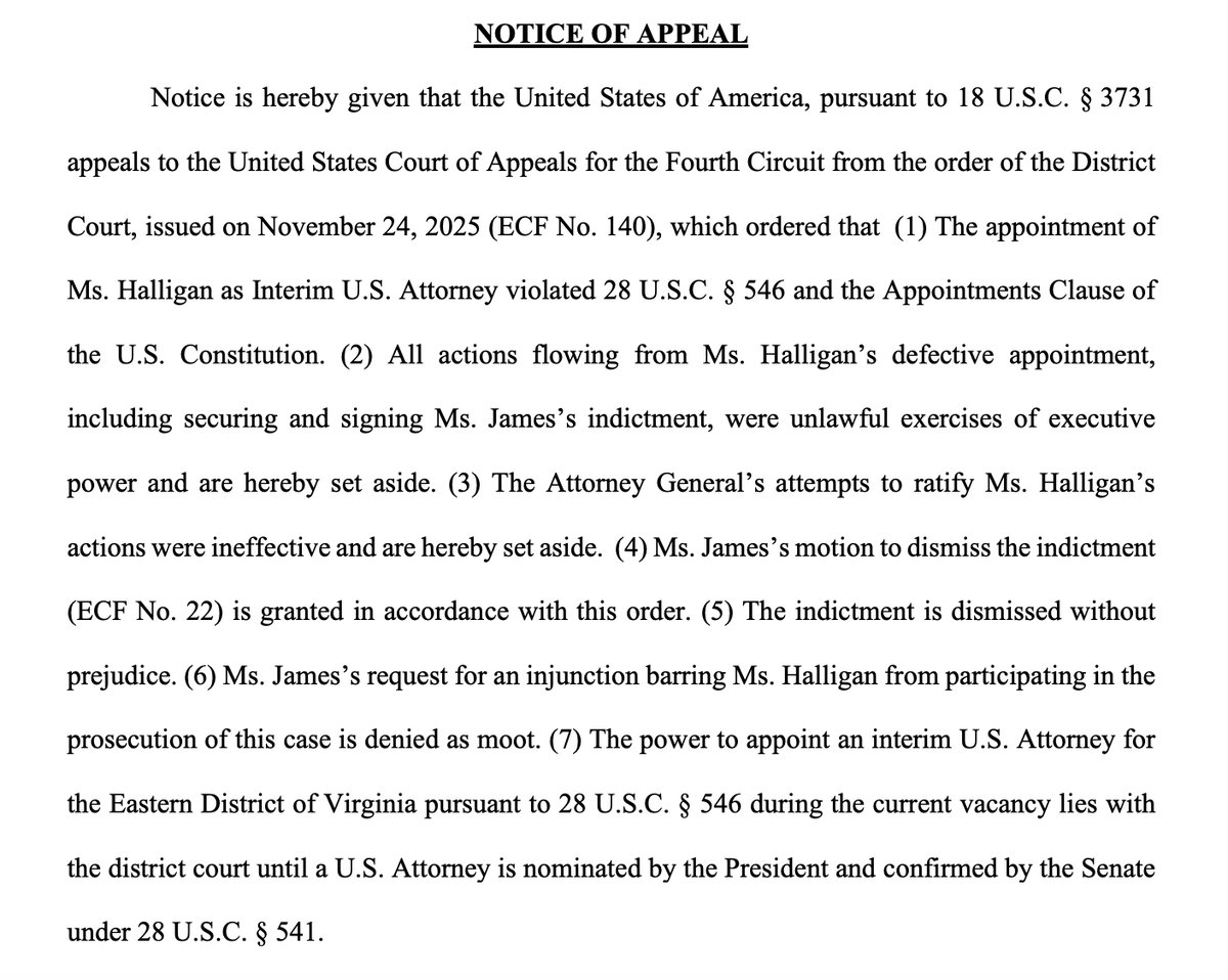 Read more: https://www.nbcnews.com/politics/justice-department/trump-admin-appeals-dismissal-indictments-james-comey-letitia-james-rcna245847