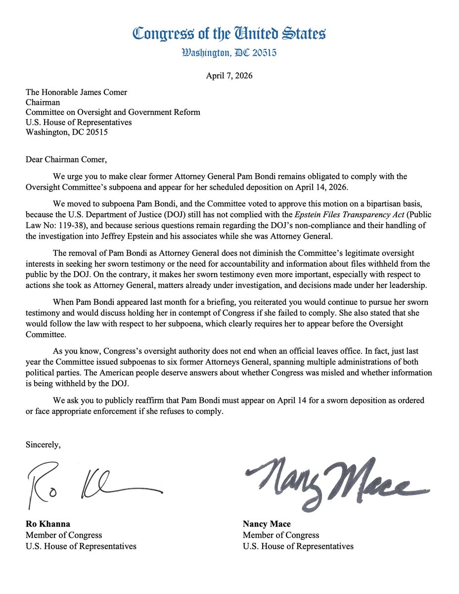 Reps. Nancy Mace and Ro Khanna press Oversight Committee chair James Comer to "make clear former Attorney General Pam Bondi remains obligated to comply" w/ the panel's subpoena.