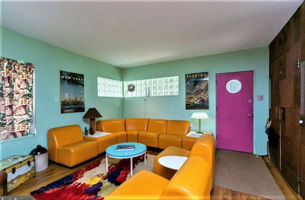 It's a great conversation pit, I'd just change the walls to make it a little less "dentist office". Bluer walls (match the tabletop), red door to match the carpet, and change the curtain on the left to a neutral or containing the burnt-orange couch tone, and it's actually fine. I'd also elect to paint the ceiling either same as the walls or matching the door. With a palette that vivid, you can't include too many extra off-colors.