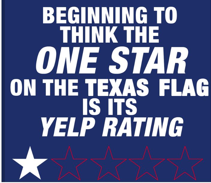 And the Texas yelp rating is right on the money, but only because Abbott and republicans are in charge of the state. It could be a magnificent place if Democrats were in charge.
