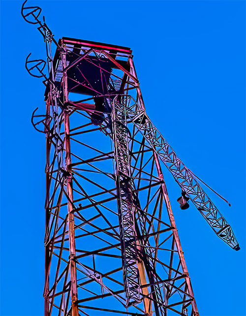 OSHA will be investigating why the gin pole failed as the pylon was being removed. The rooster head apparently fell out of the top section of the pole, taking the load line with it. The bridle slings are still connected to the pole and the tower.