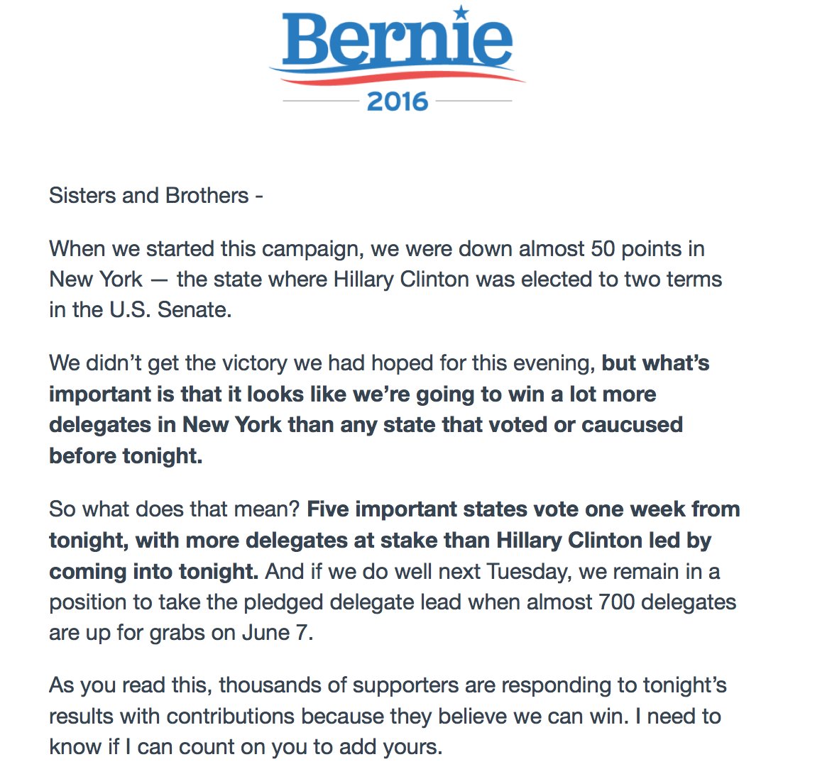 Sanders to supporters on losing NY: It elected Clinton senator twice, hes still winning delegates, hope isn't lost.