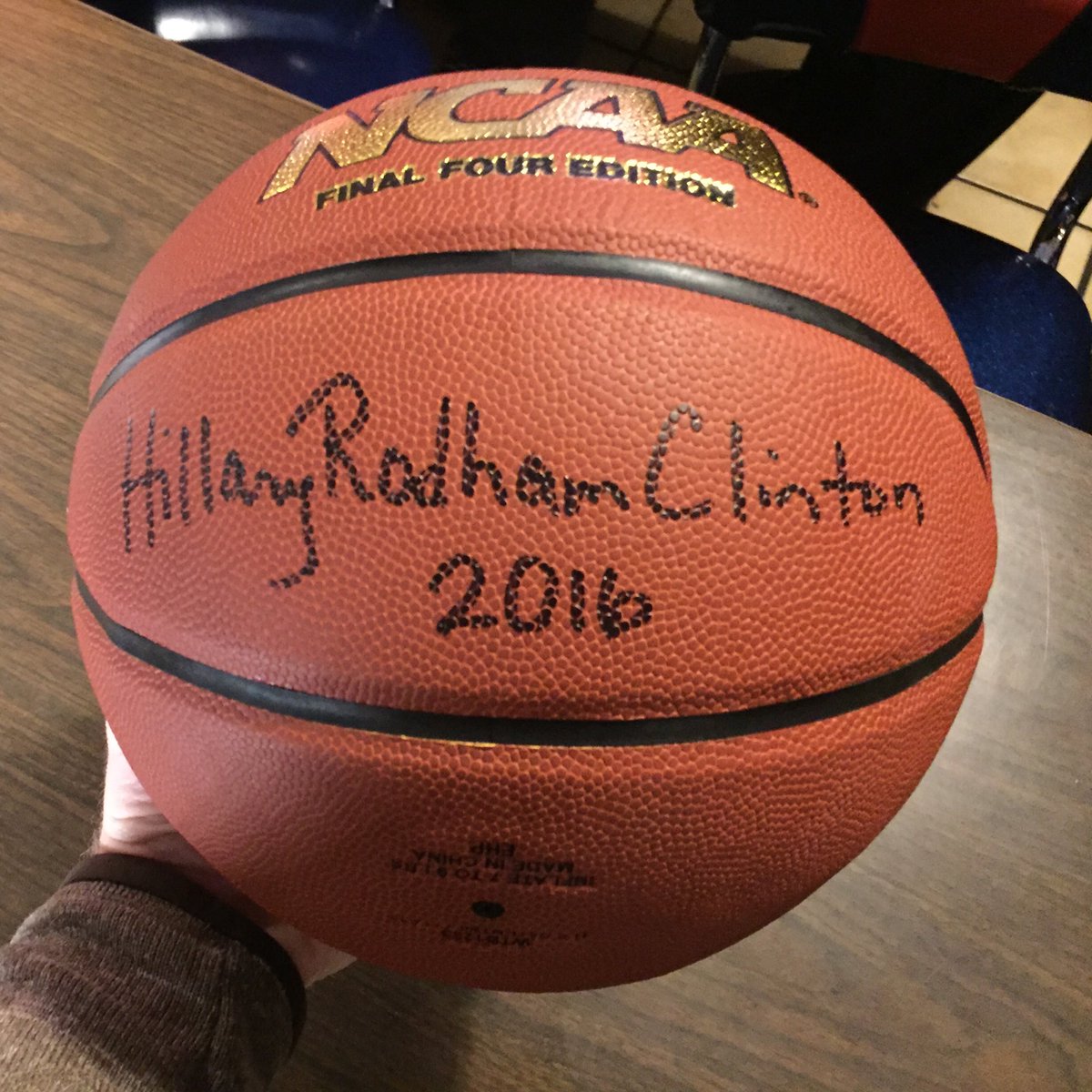 Hillary Clinton signed two basketballs: One for the Syracuse men's basketball team and the other for the women.