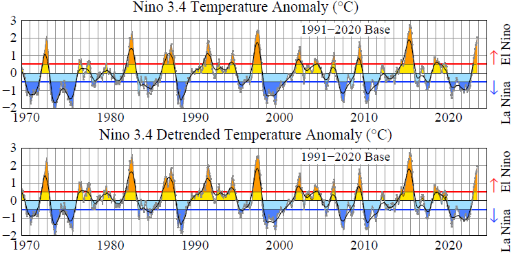 Fig. 2. Temperature in the tropical Pacific region used to define El Nino strength. El Nino (La Nina) is nominally defined to occur when Nino 3.4 is > 0.5°C (< 0.5°C).