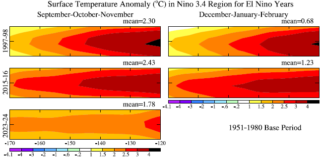 Fig. 6. Global temperature (relative to 1880-1920 mean for each month) for the 1997-98, 2015-16 and 2023-24 El Ninos. The impact of El Nino on global temperature usually peaks early in the year (the El Nino Peak Year) following the year in which the El Nino originated.