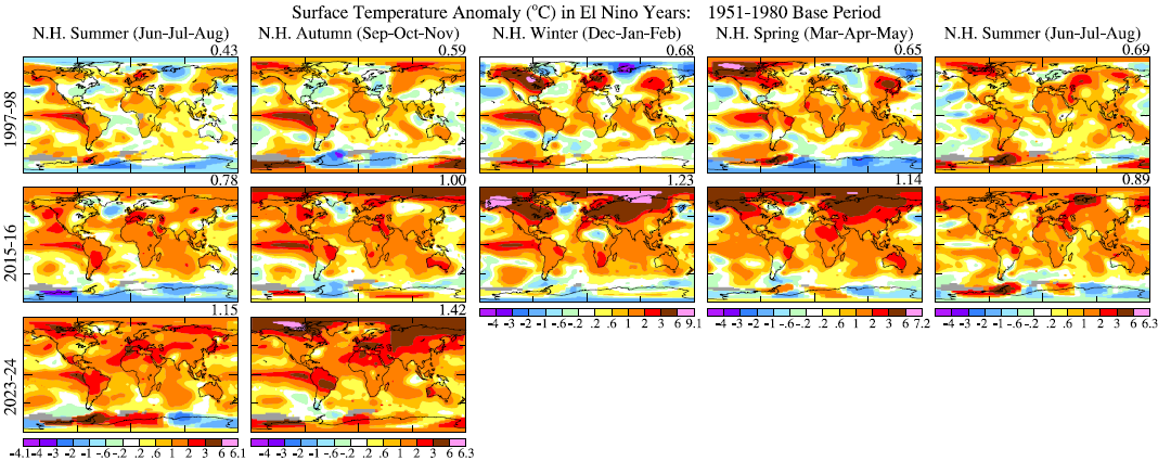 Fig. 3. Global temperature by season during growth and phasedown of the 3 large El Ninos.