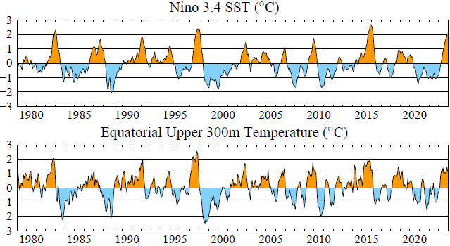 ⁷ Nino3.4 data are ERSSTv5 (1991-2020 base period) for 5°S-5°N, 170-120°W, while the equatorial upper 300m temperature data use 1981-2010 base period.for 5°S-5°N, 180-100°W1744