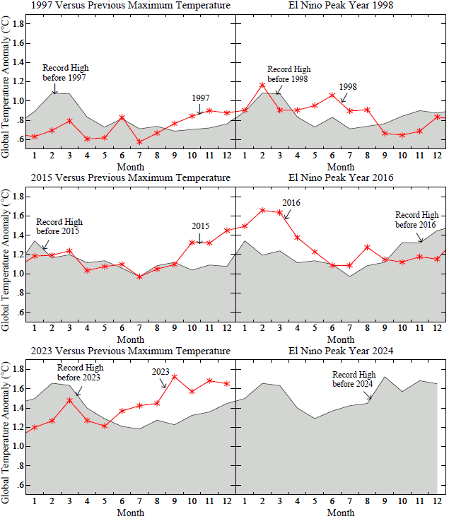 Fig. 2. Global temperature during El Nino origin years (left side) and El Nino peak years, compared with monthly record high temperatures prior to the last three strong El Ninos.