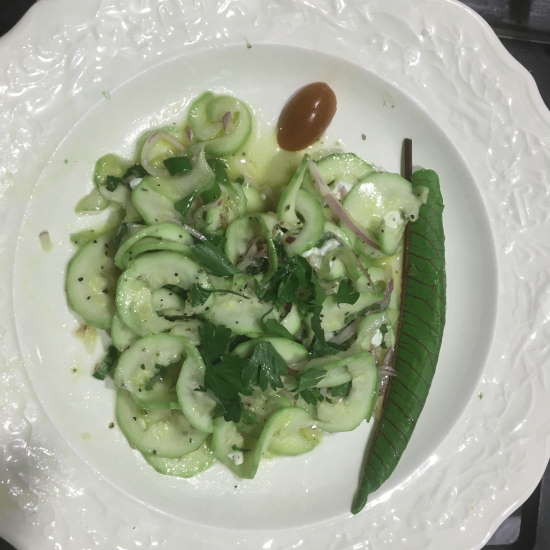 I made the salad with my spiralizer. It's Zucchini Salad with Goat Cheese, Red Onion, Scallion, with Mint and Parsley. The dressing is olive oil and lemon juice with seasonings. Here's a pic:
