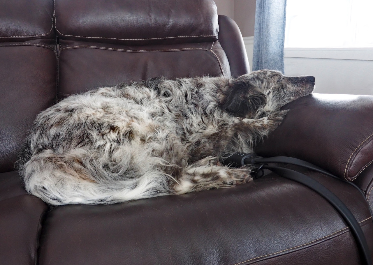 Shadow laid her head down on our still-pretty-new couch today. Just like on the old couch at the old house.