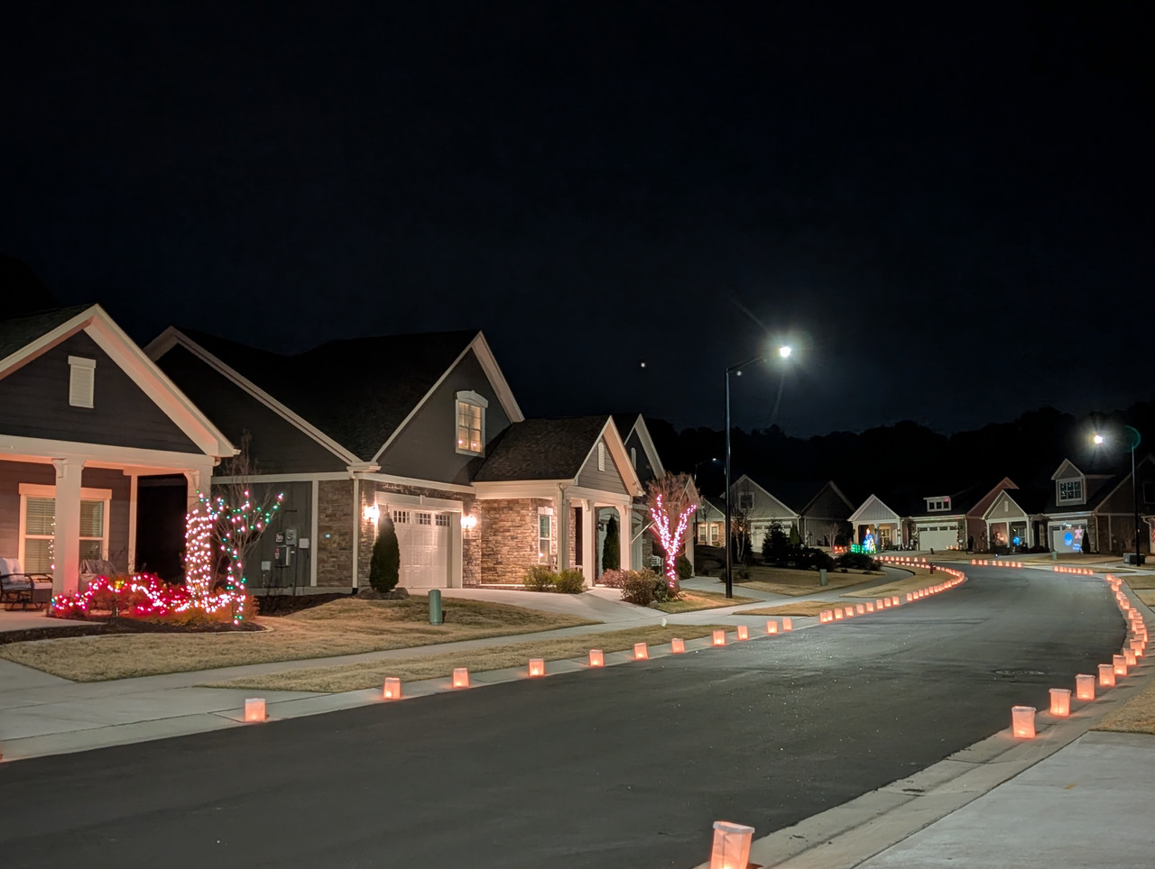 It was our Luminaries night. I live in a development in Durham, NC which buys luminaries from the Triangle Ronald McDonald House and puts them out one night in December. There are about 160 houses and all the streets were lined with luminaries. We raised $4,000. for the Ronald McDonald houses in the Triangle this year